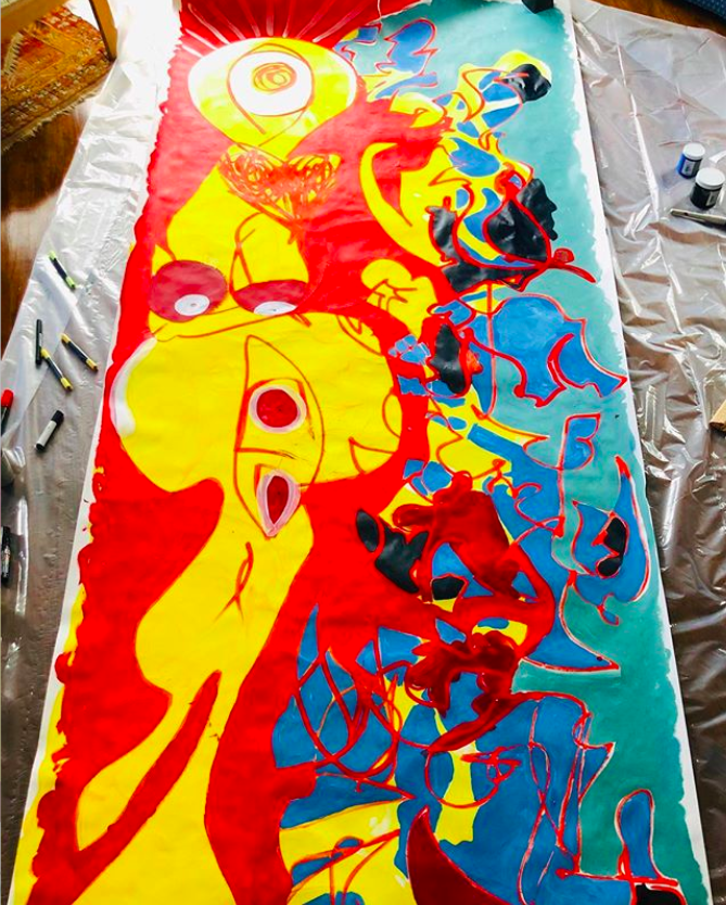 8 by 5 foot stamping of Tex's pained dance body